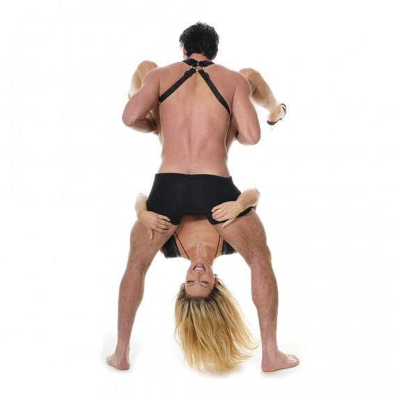Фиксация крепится на мужчине как сбруя, и женщина удерживается на весу при помощи петель для ног и специальных креплений на шее мужчины